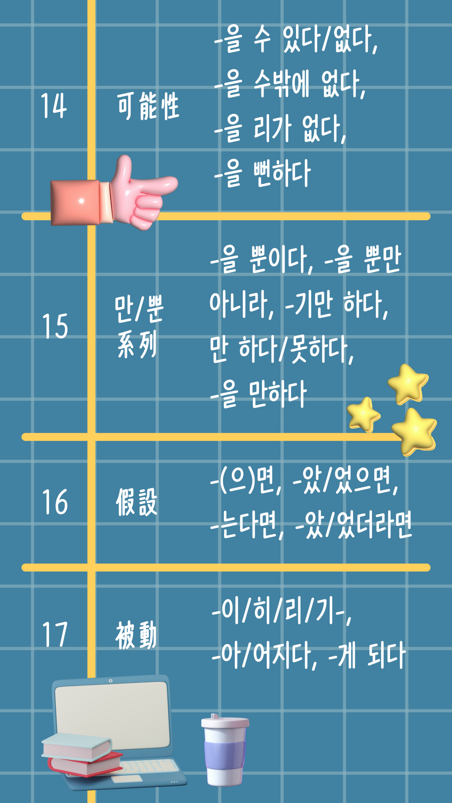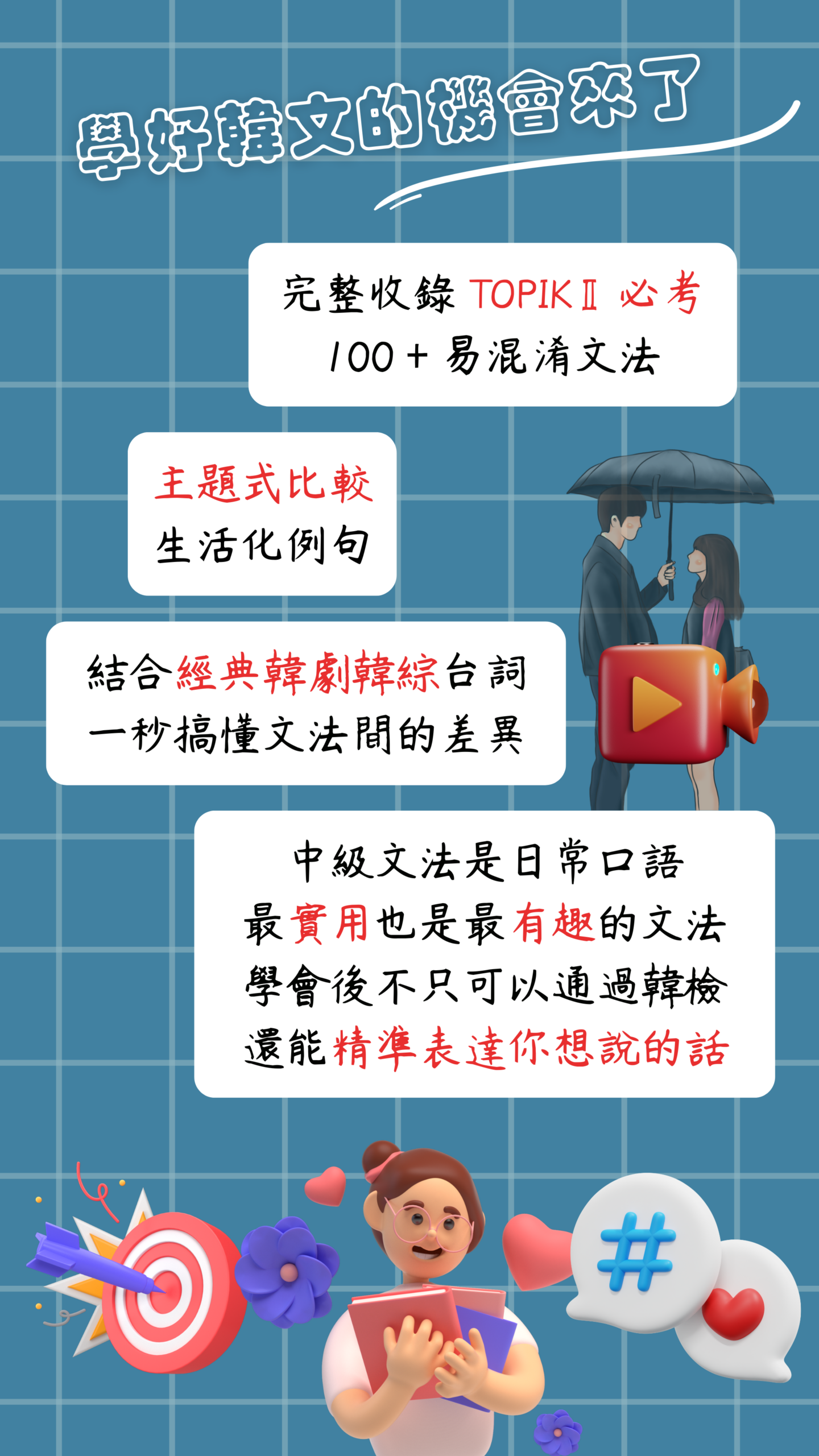 • 完整收錄TOPIK Ⅱ 必考100+文法